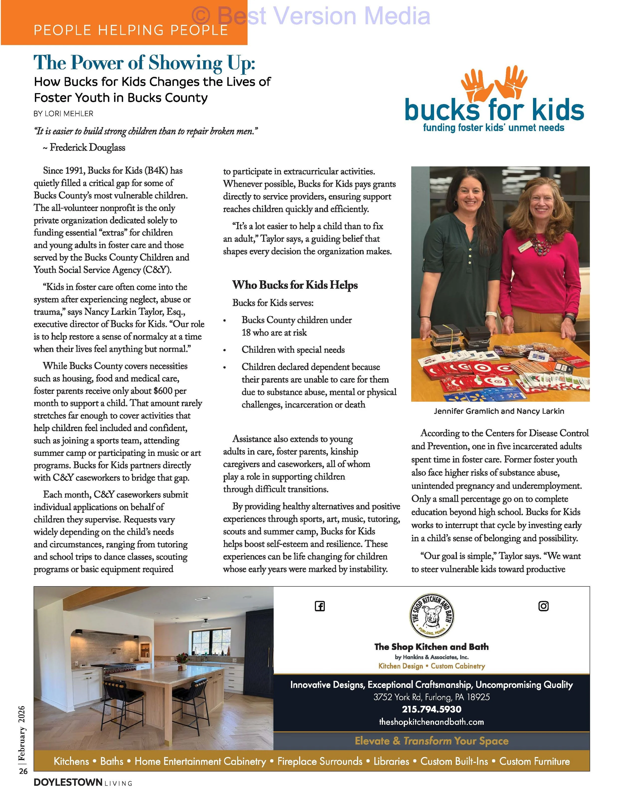 February 2026 – Bucks for Kids was featured in Doylestown Living’s February Issue. The Power of Showing Up: How Bucks for Kids Changes the Lives of Foster Youth in Bucks County. The article brings awareness to Bucks for Kids mission and showcases their impact on the community.